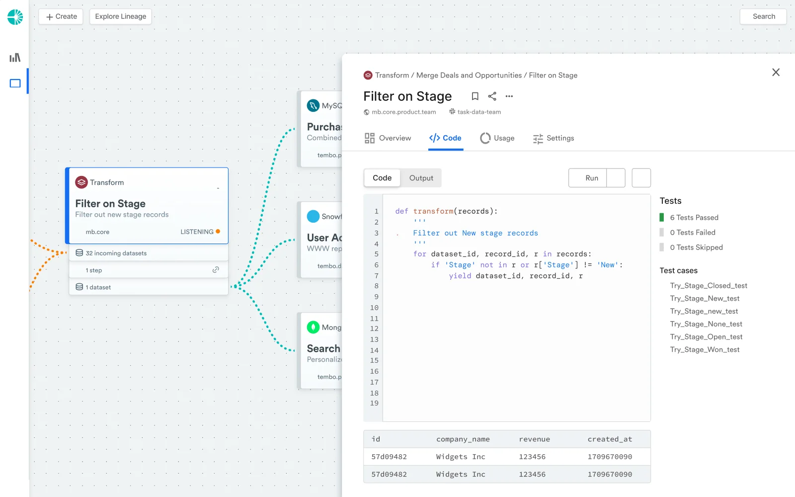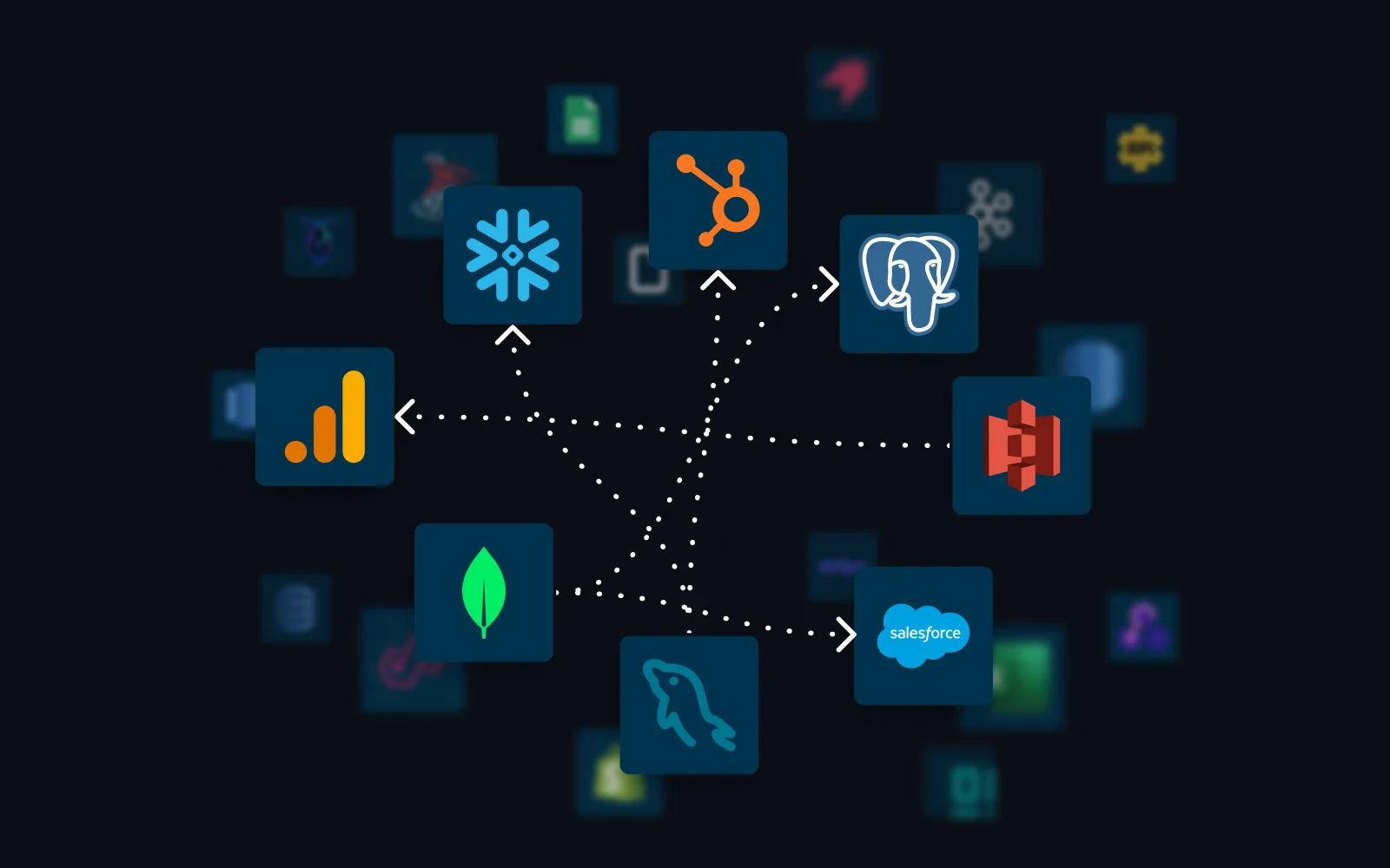 Pull data from anywhere—Salesforce, PostgreSQL, legacy systems. Automatic schema detection means you start flowing immediately. No upfront modeling required.